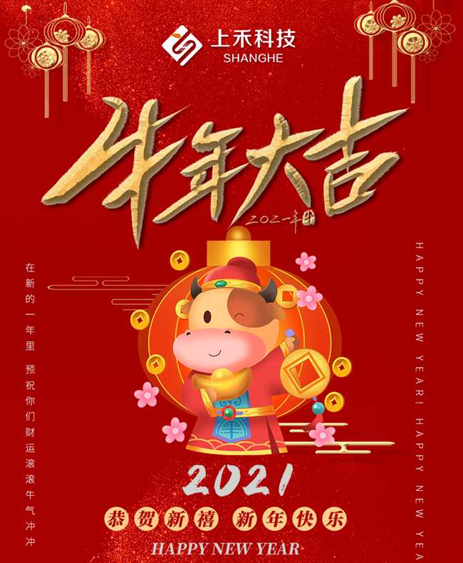 新年的祝福和希望,已經踏著月光靜靜地融在雪地裏,它們随著春天生長,送給您一年的豐碩與芬芳!牛年快樂!萬事如意!新年的鍾聲已經響起,願這吉祥的鍾聲能爲您及家人帶來平安、幸福、健康和快樂!上禾科技全體員工給大家拜個早年啦!